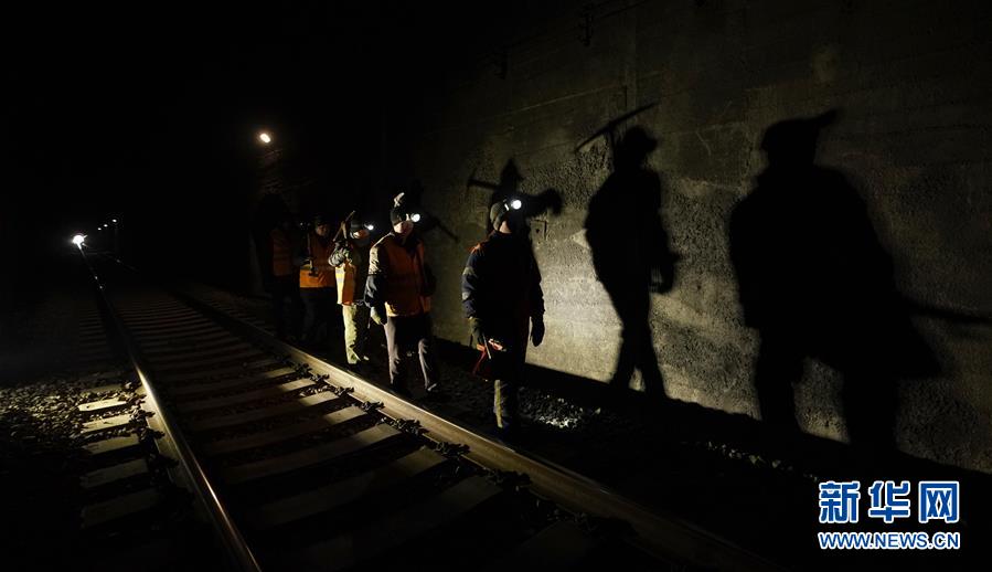 1月9日,在加格達(dá)奇工務(wù)段西羅奇嶺二號隧道,西羅奇維修工隊(duì)工作人員進(jìn)行隧道除冰作業(yè)后準(zhǔn)備返回工隊(duì)住所。新華社記者王毓國攝