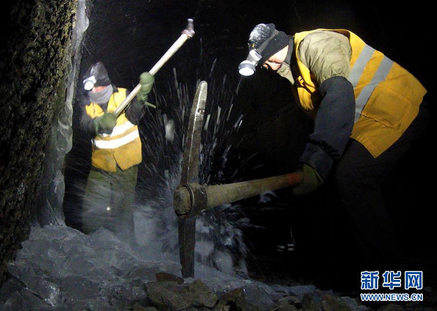 1月7日,在加格達(dá)奇工務(wù)段西羅奇嶺二號(hào)隧道,西羅奇維修工隊(duì)工作人員進(jìn)行隧道除冰作業(yè)。新華社記者王毓國攝