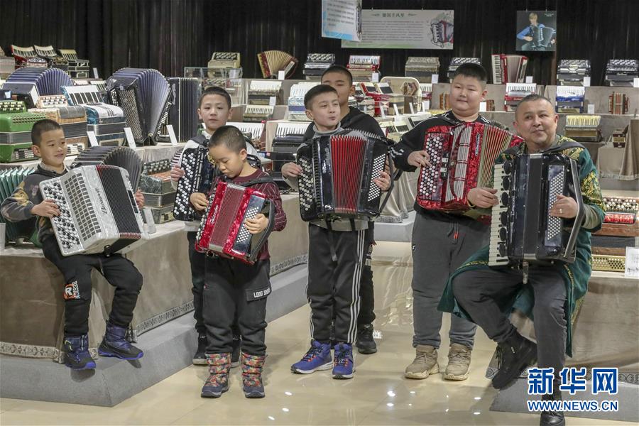 在塔城市手風琴博物館,當?shù)匚乃噽酆谜邽橛慰脱葑嗍诛L琴(1月21日攝)。新華社記者 趙戈 攝