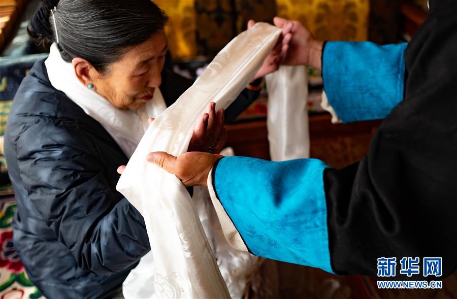 一名藏族群眾給長輩敬獻(xiàn)哈達(dá),祝福長壽(2月24日攝)。新華社記者普布扎西攝