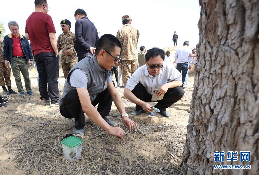 2月26日,在巴基斯坦信德省,中國蝗災(zāi)防治工作組專家采集蝗蟲蟲卵。新華社記者劉天攝