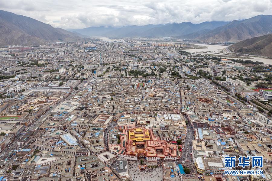 8月10日無(wú)人機(jī)拍攝的大昭寺和布達(dá)拉宮。新華社記者王建華攝