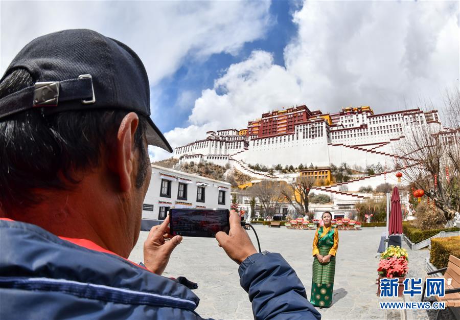 3月1日,布達(dá)拉宮管理處講解員次仁卓嘎(右)在進(jìn)行直播。新華社記者春拉攝