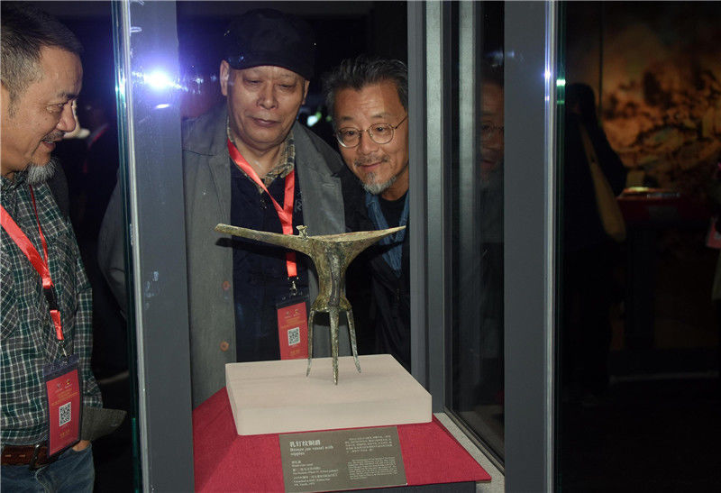 圖為參加開館儀式的專家學者參觀“鎮(zhèn)館之寶”之一的乳釘紋銅爵酒禮器(夏,二里頭文化四期)。