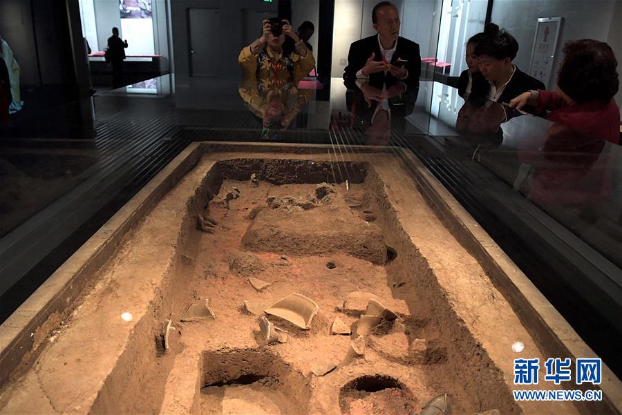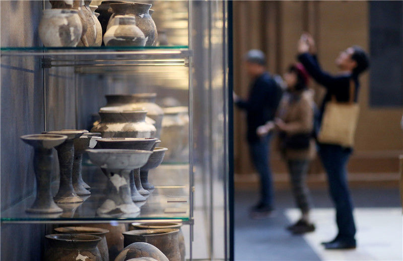 參觀者在二里頭夏都遺址博物館觀看展出的陶器(2019年10月19日攝)。新華社記者李安攝