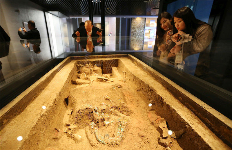 2019年10月19日,河南洛陽(yáng),二里頭夏都遺址博物館。觀眾在觀看當(dāng)年的考古現(xiàn)場(chǎng)。