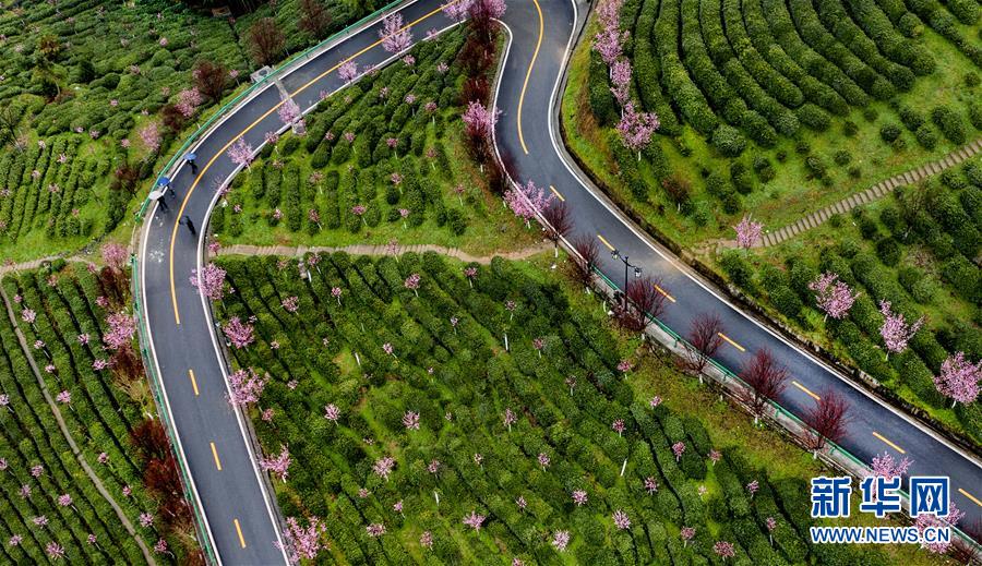 這是3月2日拍攝的平利縣長(zhǎng)安鎮(zhèn)洪福茶山,道路兩旁的春梅盛開(無人機(jī)照片)。新華社記者陶明攝