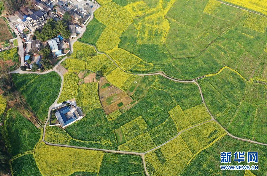 2月25日在四川省崇州市農(nóng)業(yè)產(chǎn)業(yè)功能區(qū)拍攝的油菜花田(無人機(jī)照片)。初春時(shí)節(jié),正值農(nóng)時(shí)。成都平原西部的大邑、崇州等縣市油菜長(zhǎng)勢(shì)良好,一片生機(jī)盎然的景象。新華社記者王曦?cái)z