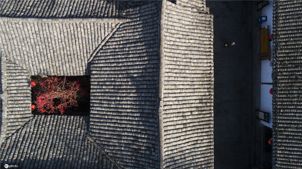 2020年2月21日,四川南充閬中古城中天樓旁,張家小院天井中的海棠在陽(yáng)光中綻放(無(wú)人機(jī)拍攝)。