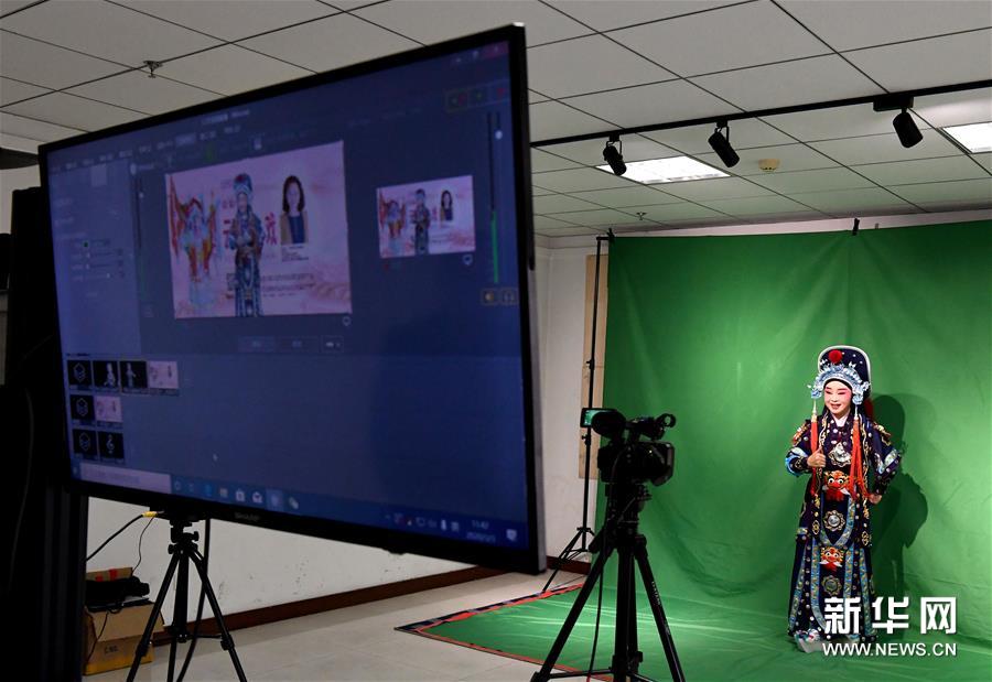 3月3日,李金玲在鄭州文化館通過直播的形式進(jìn)行帶妝表演豫劇《花木蘭》選段。新華社記者 李安 攝