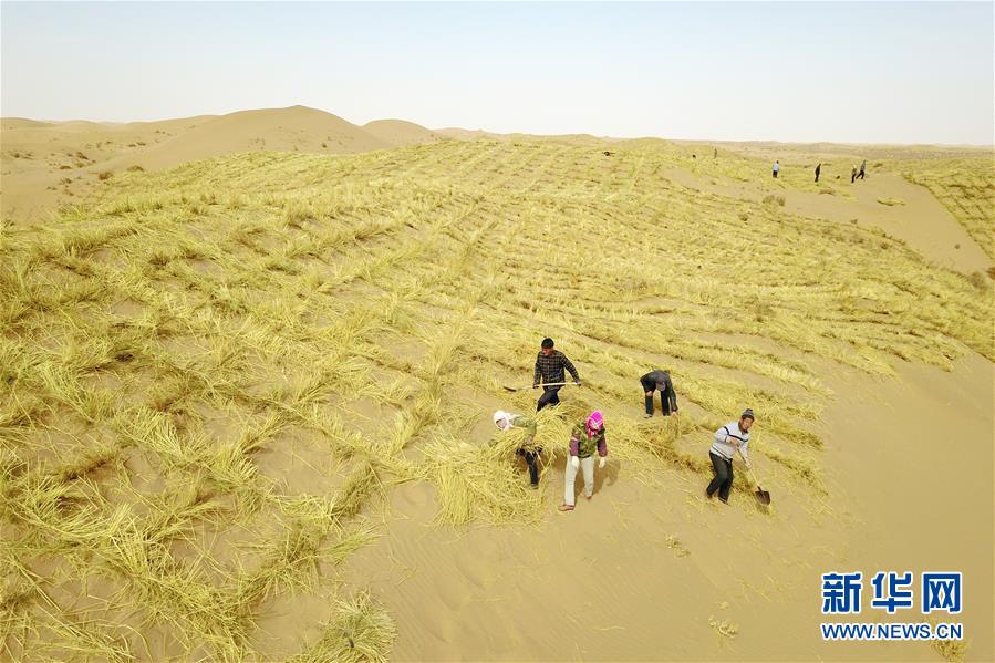 3月5日,在古浪縣北部沙區(qū)旱麻崗治沙點,群眾扎草方格壓沙(無人機照片)。初春時節(jié),在騰格里沙漠南緣的甘肅省武威市古浪縣,當(dāng)?shù)馗刹柯毠ぜ鞍瞬缴沉謭鲋紊橙斯餐诳h城北部沙區(qū)旱麻崗治沙點開展春季治沙勞動。新華社記者 范培珅 攝