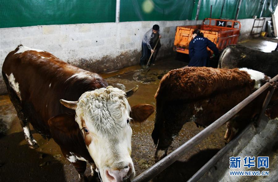 在貴州省銅仁市德江縣平原鎮(zhèn)坳田村,養(yǎng)殖戶在坳田畜牧養(yǎng)殖農(nóng)民專業(yè)合作社清理牛舍(2月29日攝)。新華社記者 楊文斌 攝