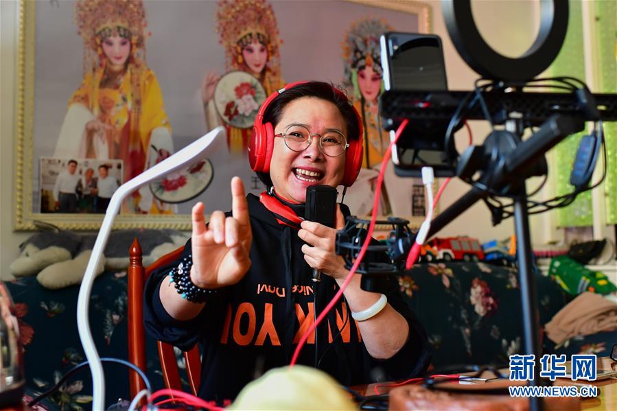閻惠貞(右)在和直播平臺的戲迷打招呼(3月6日攝)。 新華社記者 曹陽 攝