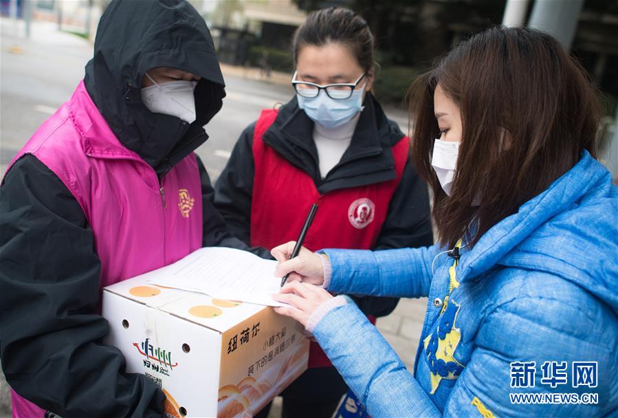 3月12日,小區(qū)工作人員為黎婧(右)準備了一箱臍橙。 3月12日,插畫師黎婧和84位病友離開自己居住的武漢軟件工程職業(yè)學院康復驛站,回到自己家中。他們都是治愈出院的新冠病毒肺炎患者,已經(jīng)在武漢軟件工程職業(yè)學院康復驛站進行了14天醫(yī)學觀察,達到醫(yī)學標準,成功解除隔離。他們由專車運送至所屬社區(qū)附近的集散點后,在社區(qū)工作人員的陪同下回家。 新華社記者 肖藝九 攝