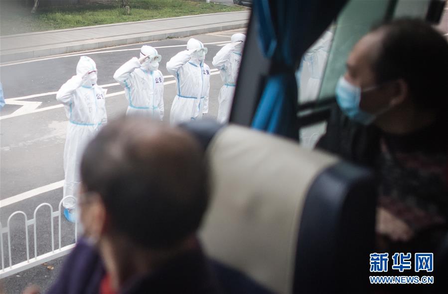 3月12日,臨出發(fā)前,公安民警向車上的治愈患者敬禮。 3月12日,插畫師黎婧和84位病友離開自己居住的武漢軟件工程職業(yè)學院康復驛站,回到自己家中。他們都是治愈出院的新冠病毒肺炎患者,已經在武漢軟件工程職業(yè)學院康復驛站進行了14天醫(yī)學觀察,達到醫(yī)學標準,成功解除隔離。他們由專車運送至所屬社區(qū)附近的集散點后,在社區(qū)工作人員的陪同下回家。 新華社記者 肖藝九 攝