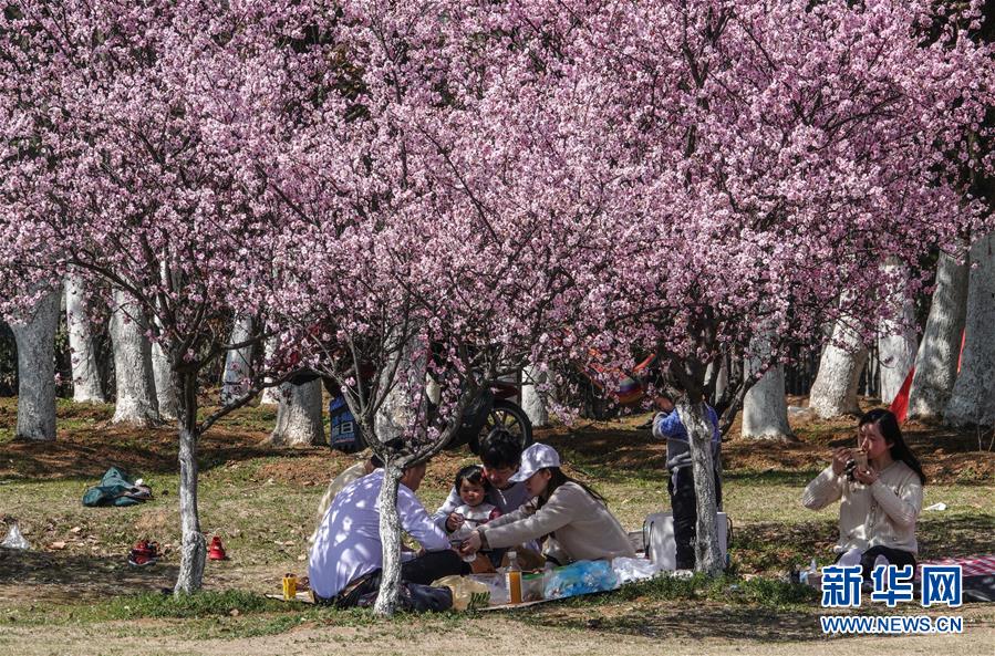 3月15日,在南京東郊體育公園,市民在櫻花樹(shù)下休息賞櫻。 當(dāng)日,南京風(fēng)和日麗,市民們來(lái)到東郊體育公園,踏青春游。 新華社記者 楊磊 攝