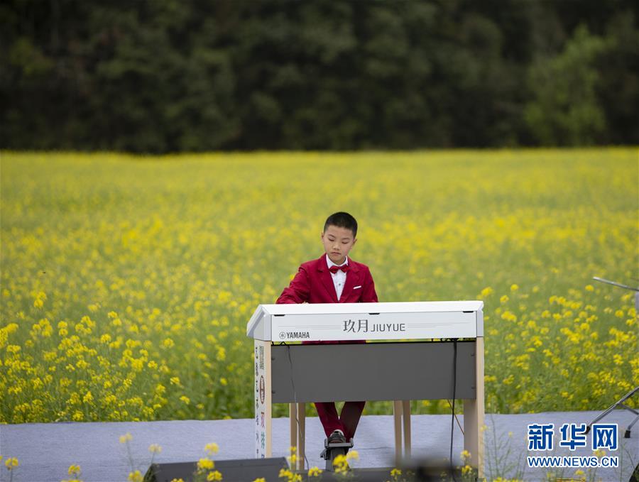 3月16日,一名小演員在李坑村的“花田音樂(lè)會(huì)”上演奏。 當(dāng)日,一場(chǎng)別開(kāi)生面的“花田音樂(lè)會(huì)”在江西省婺源縣秋口鎮(zhèn)李坑村的油菜花海中舉行,帶給游人新鮮的視聽(tīng)感受。 新華社記者 張浩波 攝
