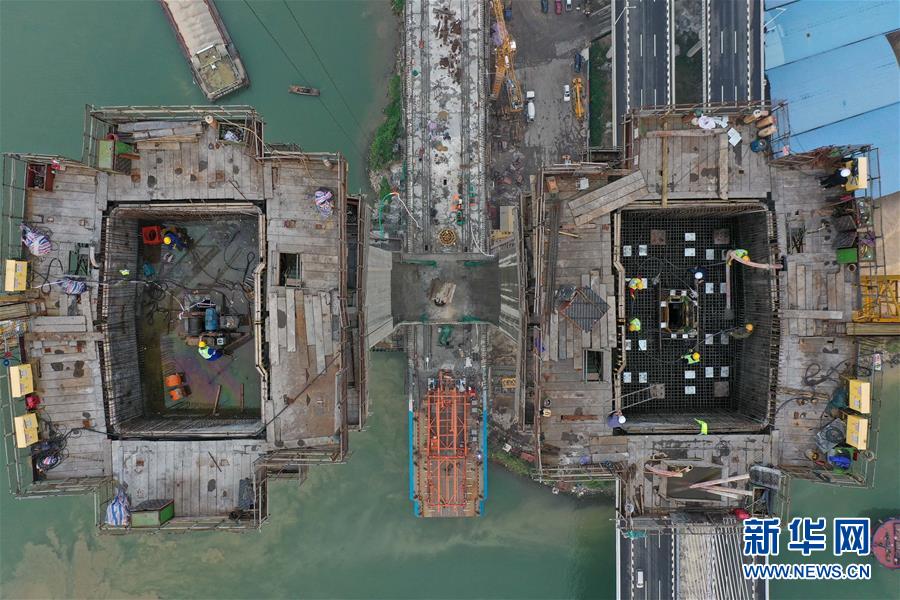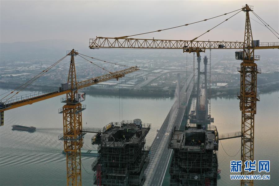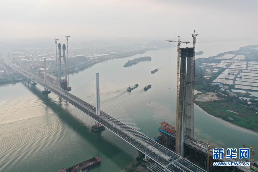 3月18日拍攝的廣州南沙港鐵路跨西江斜拉橋主塔封頂施工現(xiàn)場(chǎng)(無(wú)人機(jī)照片)。當(dāng)日,中鐵十一局承建的粵港澳大灣區(qū)重點(diǎn)工程——廣州南沙港鐵路跨西江斜拉橋主塔封頂,大橋整體建設(shè)取得重要進(jìn)展。該橋位于廣東佛山市和江門(mén)市交界處,全長(zhǎng)1117.5米。新華社記者劉大偉攝