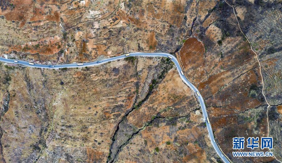 搬家的貨車行駛在云南省永善縣大興鎮(zhèn)駱丘村通往山外崎嶇的山路上(3月14日攝,無人機照片)。 新華社記者 江文耀 攝
