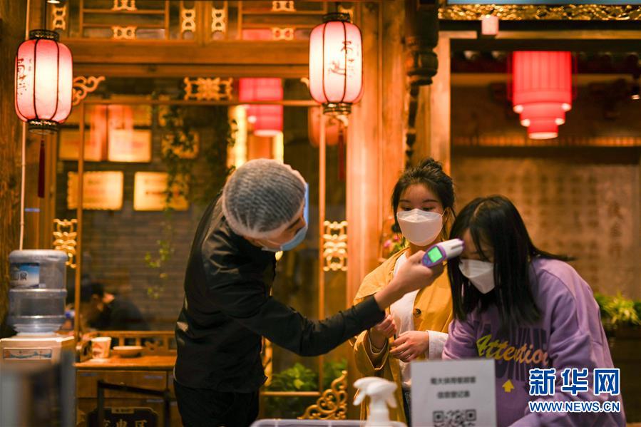 3月21日,在四川省成都市的一家火鍋店門(mén)口,顧客在登記信息,接受體溫檢測(cè)。近日,在做好新冠肺炎疫情防控措施的基礎(chǔ)上,四川省成都市的火鍋店逐漸恢復(fù)營(yíng)業(yè)。新華社記者唐文豪攝