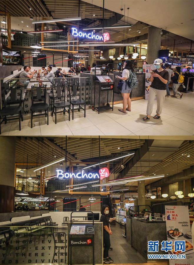 這是3月21日拍攝的泰國曼谷暹羅百麗宮商場負一層的美食城(上圖)和3月22日拍攝的美食城對比圖。商場除了負一層的美食城和超市外,全部關(guān)閉。美食城只對顧客提供外賣服務(wù)。新華社記者張可任攝
