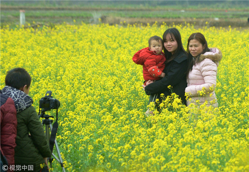 2019年2月5日,春節(jié)期間,廣西來賓市忻城縣萬余畝油菜花競相綻放,吸引眾多游客前來賞花游玩,感受春天的氣息。近年來,廣西忻城縣大力實施鄉(xiāng)村振興戰(zhàn)略,注重發(fā)展鄉(xiāng)村旅游產(chǎn)業(yè),把鄉(xiāng)村旅游與美麗鄉(xiāng)村、脫貧攻堅緊密結(jié)合起來,輻射帶動當(dāng)?shù)刎毨裘撠氈赂?。樊紹光/視覺中國