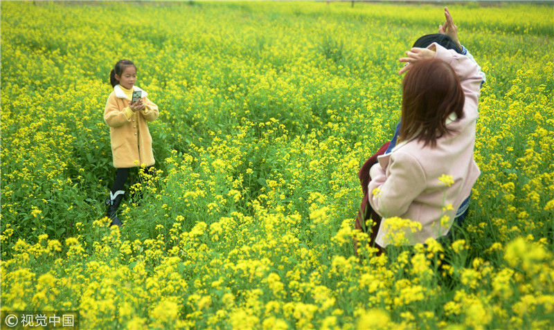 2019年2月5日,廣西來賓,當(dāng)天是農(nóng)歷大年初一,人們?cè)谛贸强h城關(guān)鎮(zhèn)隆光村油菜花海中賞花游玩。