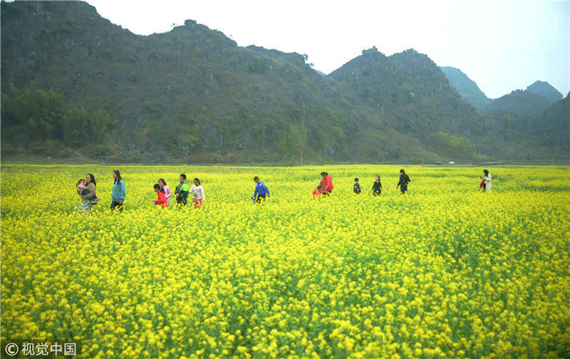 2019年2月5日,廣西來賓,當(dāng)天是農(nóng)歷大年初一,人們在忻城縣城關(guān)鎮(zhèn)隆光村油菜花海中賞花游玩。
