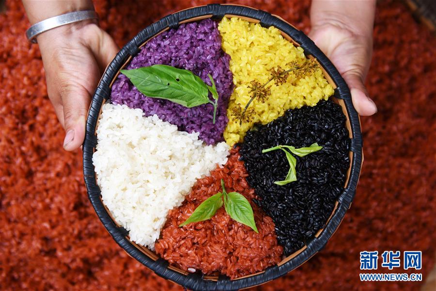 每年農(nóng)歷三月十五前后,貴州省黔東南苗族侗族自治州臺(tái)江縣苗族同胞有制作“姊妹飯”、喜迎姊妹節(jié)的習(xí)俗?!版⒚蔑垺笔鞘褂貌煌参锏臉淙~或花朵碾壓成汁液作為原色,對(duì)糯米進(jìn)行浸泡并蒸熟的五彩糯米飯。姊妹節(jié)期間,青年男子可以向心儀的姑娘討要“姊妹飯”,姑娘們則通過贈(zèng)送藏有不同物品的“姊妹飯”傳情達(dá)意。
