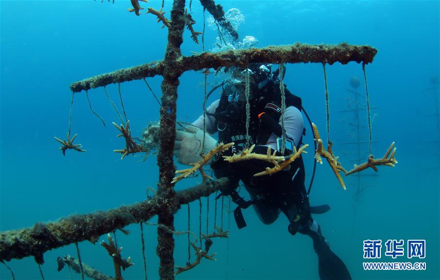 3月28日,在位于海南三亞蜈支洲島旅游區(qū)的海洋牧場,工作人員在清理附著在珊瑚上的漁網(wǎng)。近日,位于海南三亞蜈支洲島旅游區(qū)的海洋牧場復工,海底作業(yè)逐漸恢復正常,開始進行人工魚礁吊裝擺位、水下監(jiān)控清理以及日常巡護等工作。據(jù)介紹,人工魚礁有利于魚類種類增加和數(shù)量提高,蜈支洲島海域海洋牧場人工魚礁表面附著珊瑚、貝類、藻類等生物種類達120余種。新華社記者楊冠宇攝