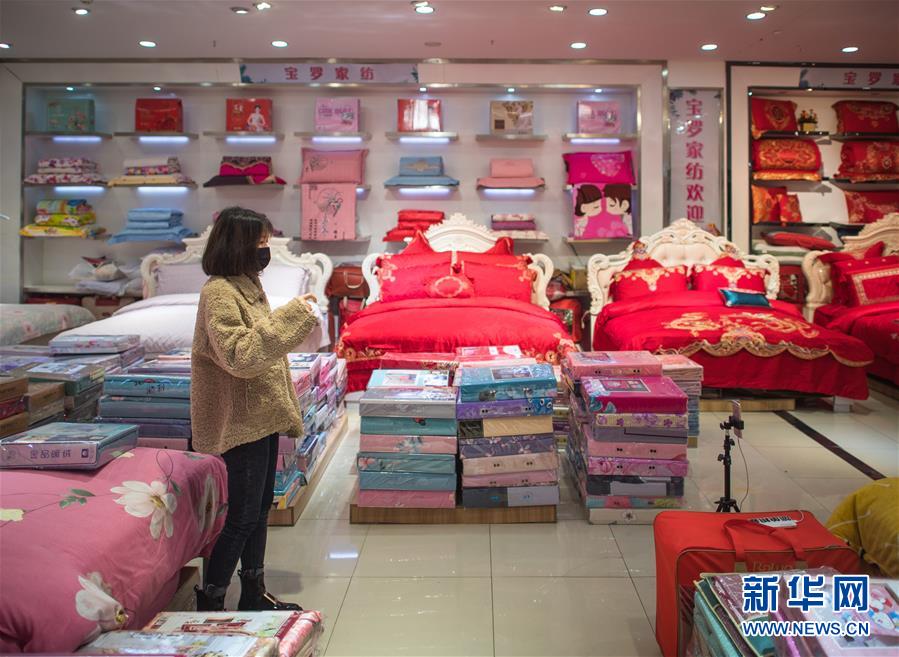3月29日,在漢口北市場,一名主播在直播平臺(tái)直播銷售床上用品。新華社記者肖藝九攝