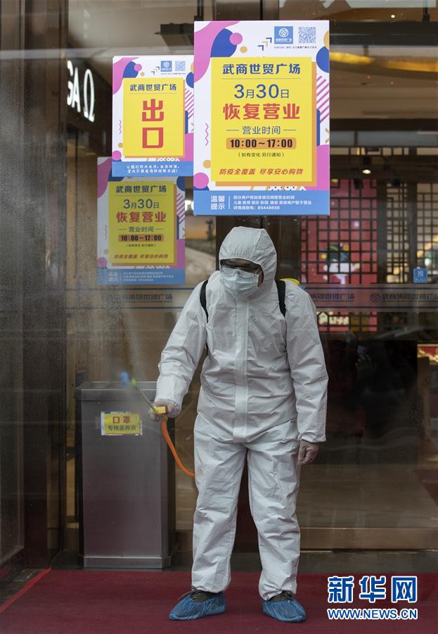 3月30日,在武商世貿(mào)廣場,工作人員在開門前進(jìn)行最后的消殺工作。當(dāng)日,武漢市多家商場開門迎客。新華社記者費茂華攝