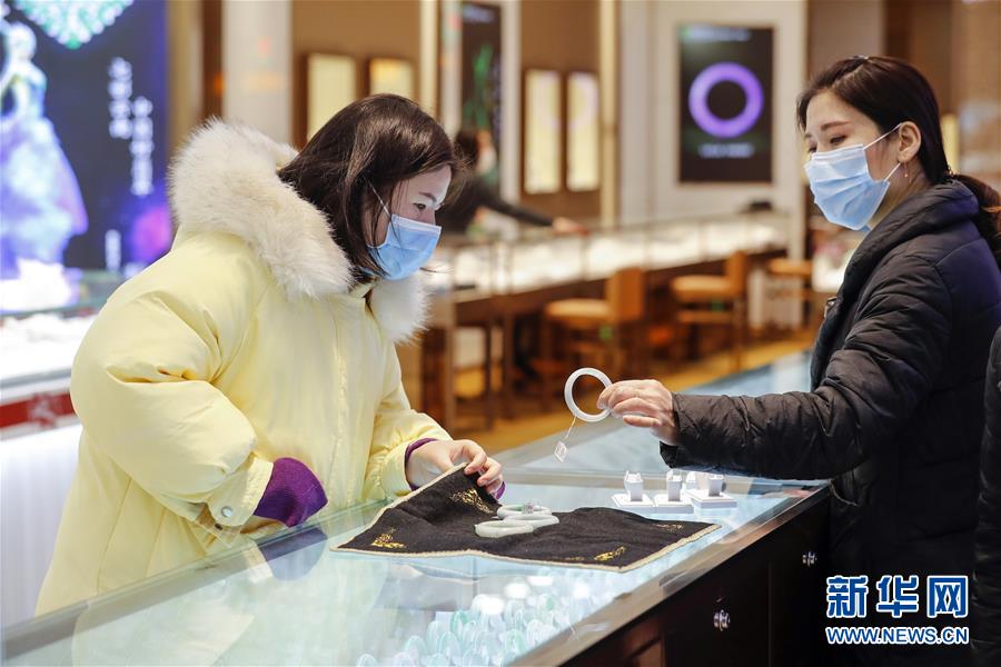 3月30日,在武漢市武商世貿(mào)廣場,一名顧客(左)在挑選手鐲。當日,武漢市多家商場開門迎客。新華社記者沈伯韓攝