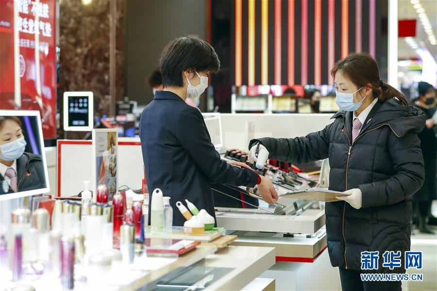 3月30日,在武漢市武商廣場,一名管理人員(右)在測量銷售人員的體溫。據(jù)了解,商場每兩小時就會測量一次所有銷售人員的體溫。當(dāng)日,武漢市多家商場開門迎客。新華社記者沈伯韓攝