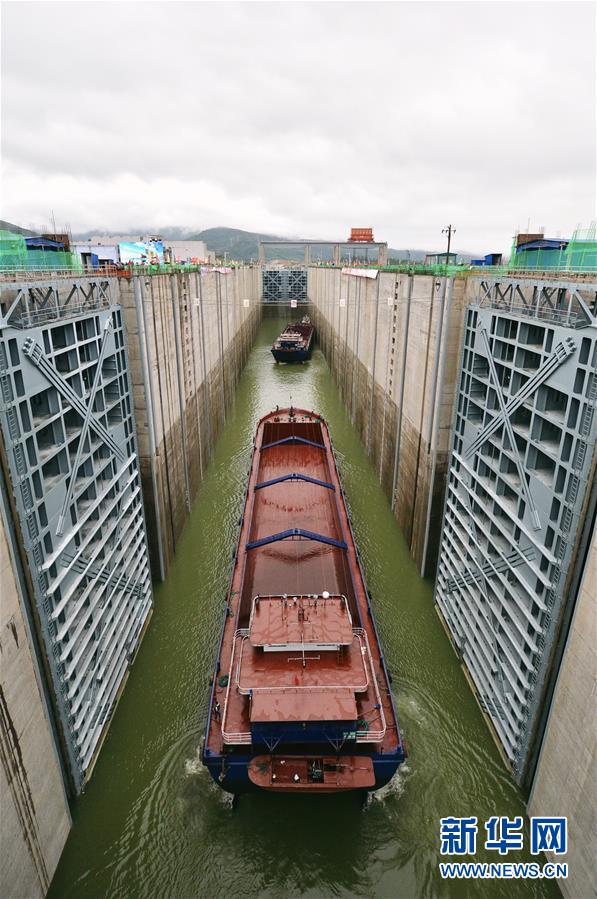 3月31日,船只駛?cè)氪筇賺{水利樞紐工程船閘閘室。新華社記者崔博文攝