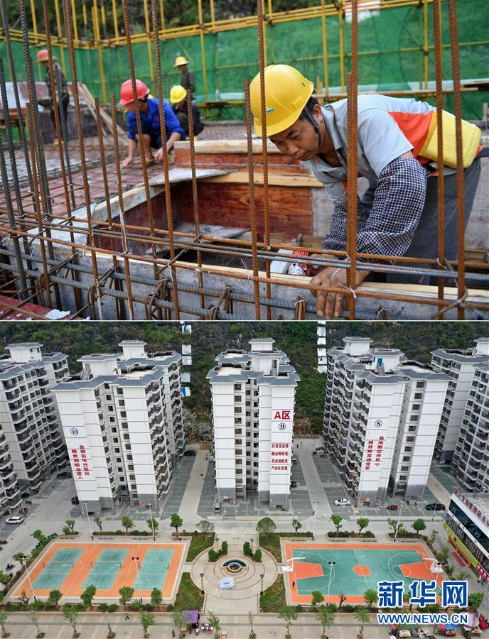 拼版照片:上圖為工人在廣西都安瑤族自治縣八仙易地扶貧搬遷安置新區(qū)項(xiàng)目施工(2016年7月25日攝);下圖為已經(jīng)建成入住的廣西都安瑤族自治縣八仙易地扶貧搬遷安置新區(qū)部分樓房(無人機(jī)照片,2019年10月16日攝)。新華社記者陸波岸攝