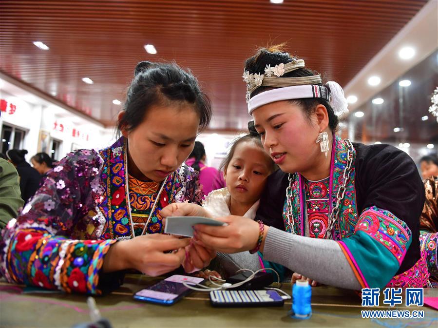 村民在廣西融水苗族自治縣易地扶貧安置點(diǎn)苗家小鎮(zhèn)“婦女之家巾幗扶貧車間”學(xué)習(xí)刺繡(2019年11月18日攝)。新華社記者黃孝邦攝