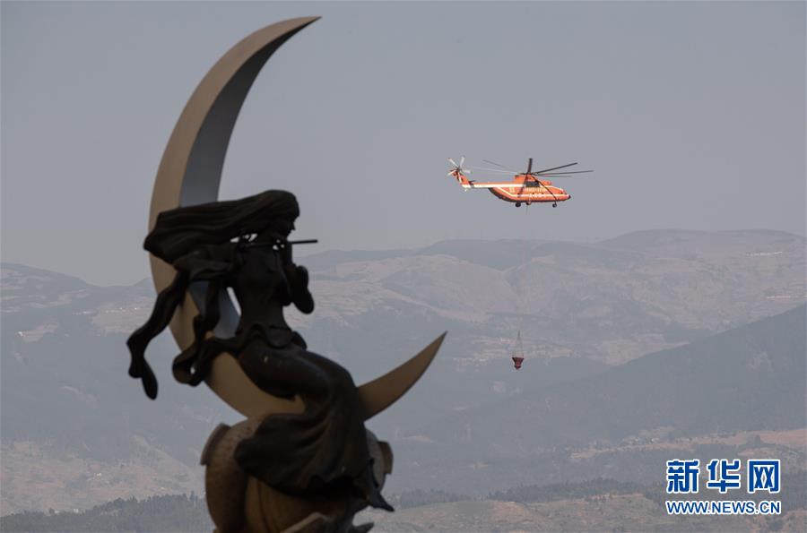 3月31日,一架參與西昌森林火災(zāi)滅火的直升機(jī)在邛海中取完水飛向火場。新華社記者江宏景攝