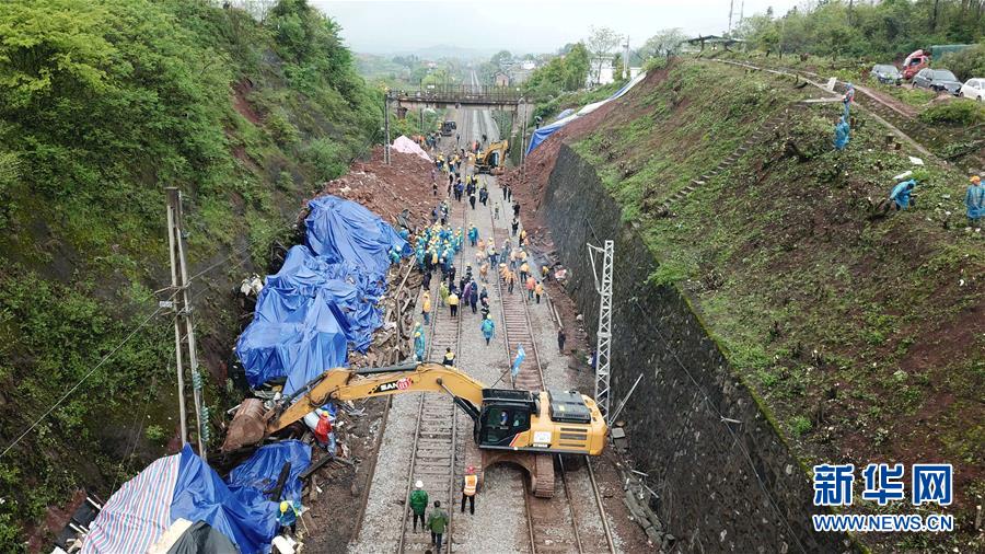 3月31日,工程車輛在T179次客運列車脫軌現(xiàn)場作業(yè)(無人機照片)。新華社發(fā)(陳振海攝)