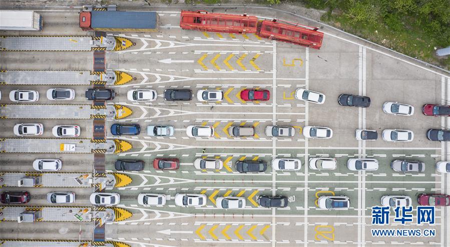 3月24日,在武漢西高速收費(fèi)站交通卡點(diǎn),返漢車輛排隊(duì)等候入城(無人機(jī)照片)。新華社記者才揚(yáng)攝