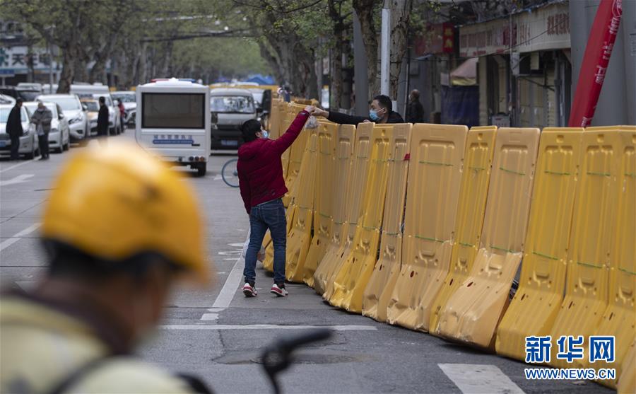 4月1日,在前進(jìn)二路,人們隔著隔離墻遞送食品。新華社記者費(fèi)茂華攝