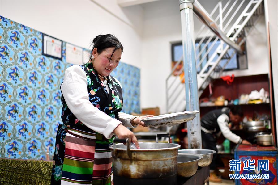 在拉薩市堆龍德慶區(qū)古榮鄉(xiāng)榮瑪高海拔生態(tài)搬遷點(diǎn),歐措(左)和兒子索朗普布在自家開(kāi)的藏餐館里忙碌(4月1日攝)。新華社記者 詹彥 攝