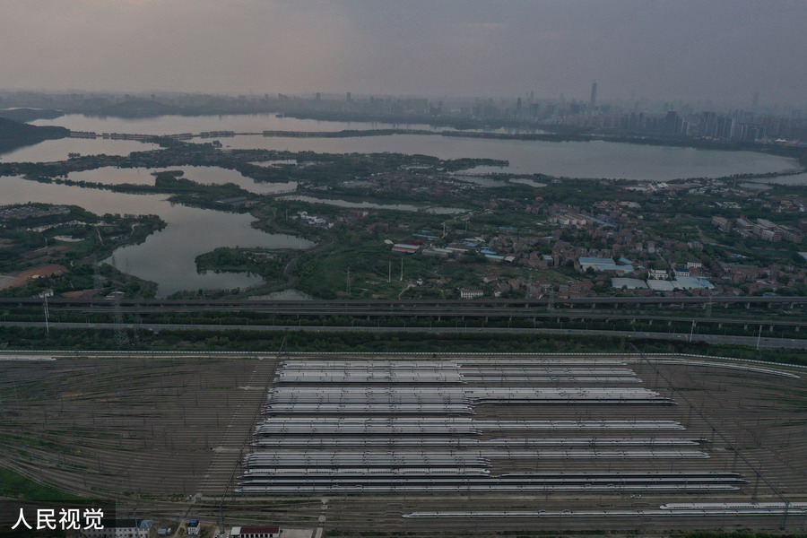 2020年4月6日,武漢動(dòng)車段高鐵動(dòng)車組整裝待發(fā)(無人機(jī)照片)。