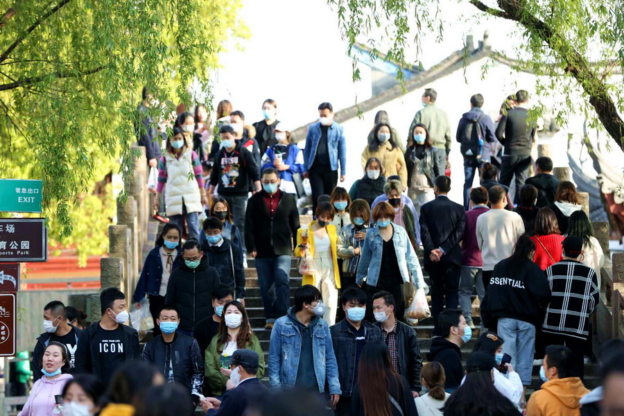 2020年4月5日,上海。清明小長假第二天,上海各景點客流攀升,游客戴口罩有序出游,踏春、防疫兩不誤。在上海千年古鎮(zhèn)七寶老街看到游客川流不息、人頭攢動。古鎮(zhèn)在各入口做好防疫措施、控制客流量。