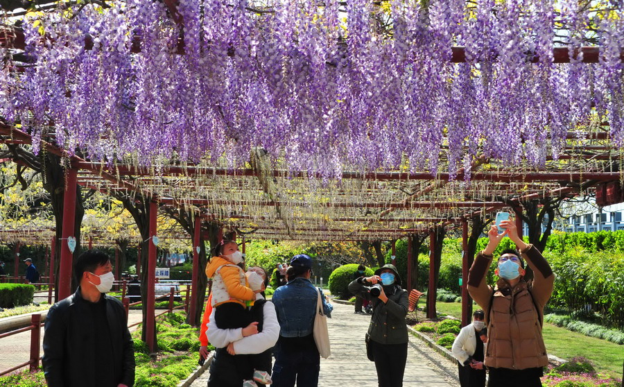 2020年4月5日,上海,每年的4月上旬至5月初是觀賞紫藤花的最佳時期。清明小長假里,晴好天氣使嘉定紫藤園迎來了不少市民游客。今年的紫藤公園采取提前預約和亮相綠色隨申碼的舉措入園賞花。公園擁有26個品種的紫藤花,盛開時期的紫藤花穗最長可達1米多?;ㄉ凶?,粉,白等,形成的花瀑宛若一簾幽夢,雅致春意今人流連忘返。