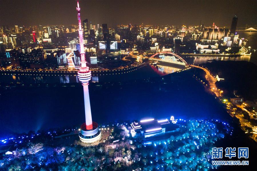 這是4月7日晚在武漢龜山拍攝的夜景(無(wú)人機(jī)拍攝)。新華社記者肖藝九攝