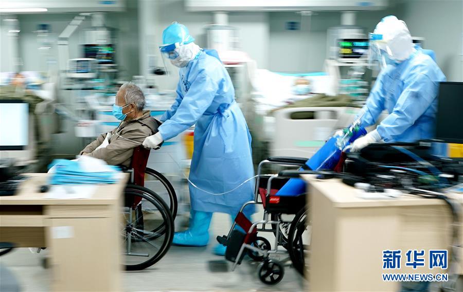 3月20日,武漢火神山醫(yī)院重癥醫(yī)學(xué)一科副主任宋立強(qiáng)(中)護(hù)送81歲的新冠肺炎重癥患者去做CT檢查。為確?;颊哂谐渥愎┭酰t(yī)生胡世頡推著氧氣瓶隨行。 新華社記者 王毓國 攝