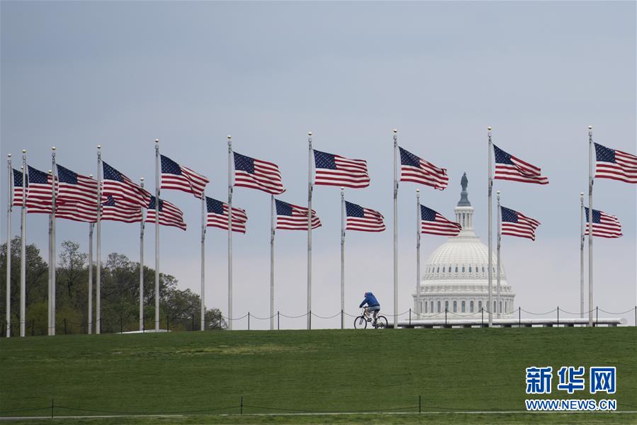 4月1日,在美國(guó)首都華盛頓,一名男子從美國(guó)國(guó)旗前騎車經(jīng)過。