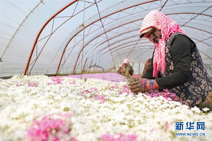 4月13日,在八角臺街道雅化村花圃內(nèi),花農(nóng)為培育的宿根花卉除草。新華社記者姚劍鋒攝