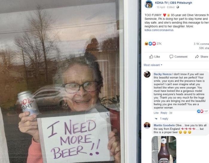 中新網(wǎng)4月14日電據(jù)美國(guó)《世界日?qǐng)?bào)》報(bào)道,近日居家避疫期間,美國(guó)賓夕法尼亞州一名愛(ài)喝啤酒的93歲老太太維若妮西(Olive Veronesi),手持一個(gè)啤酒罐及“我需要更多啤酒”的求助牌站在自家窗戶旁,家人覺(jué)得有趣把這一幕拍照上傳網(wǎng)絡(luò),后經(jīng)電視臺(tái)發(fā)布引發(fā)關(guān)注。老太太最終獲得廠商贈(zèng)酒。